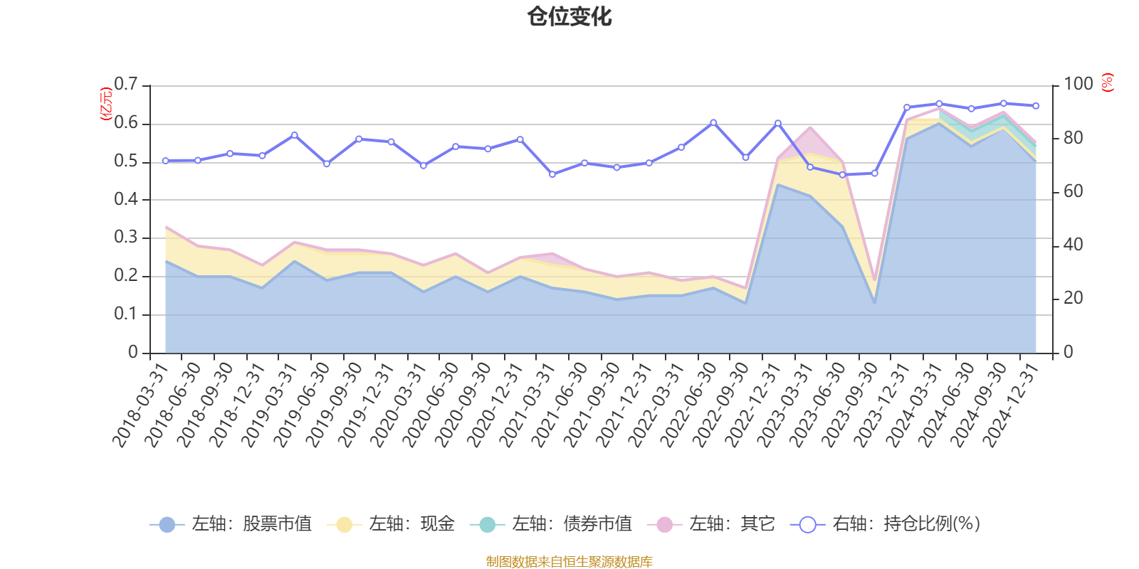 据定期报告数据统计,近三年平均股票仓位为82.26%,同类平均为83.32%。2024年三季度末基金达到93.27%的最高仓位,2023年上半年末最低,为66.63%。